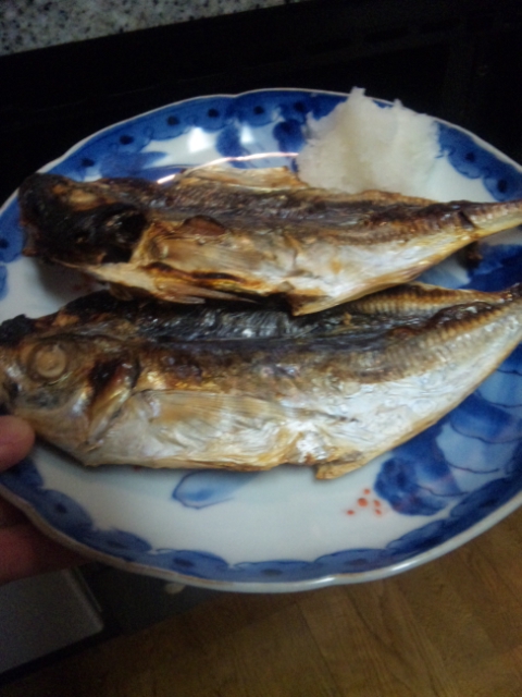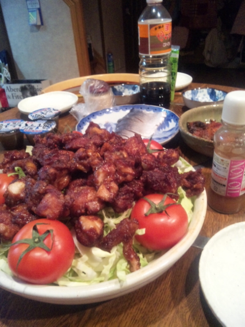 夕食:豚汁(乱名亜特製)、冷奴、串かつ、サラダ、サンマの干物