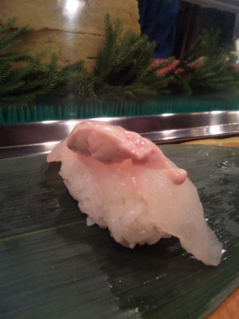 最初に出された握り(カワハギの肝付)