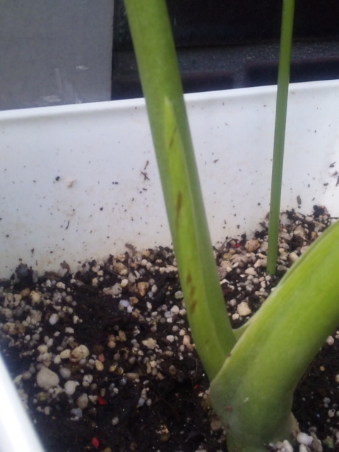 モンちゃんの新しい葉っぱの茎から新しい葉っぱが出かけてます…