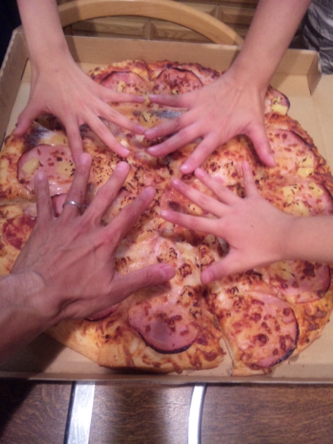 夕食:サンドイッチ、ピザ、刺身